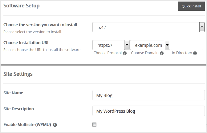 • Choose Installation URL: Choose the appropriate protocol/domain. Inside the "In Directory" field, should you want to install this in a directory, i.e. example.com/directory, enter the directory name. Otherwise, leave it blank to install in your main domain, i.e. example.com